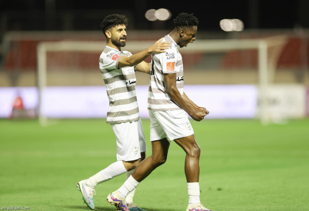 صورة التقطت في 2 مايو الماضي للغيني ألفا سيميدو، لاعب الطائي، يحتفل بإحرازه هدفًا في مرمى الفيحاء، ضمن الجولة 25 من دوري “روشن”، بعد دقائق من تسجيله بالخطأ في مرمى فريقه.. ويظهر زميله عبد الكريم السليمان (أرشيفية)