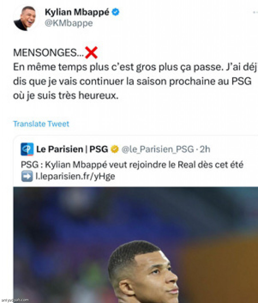 تفاعل مستخدمو موقع التدوينات القصيرة “تويتر” مع تغريدات الفرنسي كيليان مبابي، لاعب فريق باريس سان جيرمان الفرنسي، أمس، التي نفى فيها الأخبار المتداولة حول انتقاله إلى ريال مدريد الإسباني. وحظيت التغريدة بأكثر من 25 مليون ظهور خلال الساعة الأولى من نشرها. وكتب مبابي رده على تغريدة حساب “le parisien”، الذي أكد انتقال المهاجم الفرنسي إلى صفوف مدريد قائلًا: “أكاذيب، لقد قلت بالفعل إنني سأستمر الموسم المقبل في باريس”. وحصد الرد أكثر من 47 ألف إعادة تغريد، و14 ألف رد. ومن بين الردود، كتب حساب جانتي: “الجميع يعرف أن هذا الرد مجاملة لناديك”. فيما تفاعلت الجماهير الإسبانية مع التغريدة، منهم حساب الباي، الذي طالب المهاجم الفرنسي بسرعة الانتقال، كاتبًا: “ريال مدريد يحتاجك في الفترة المقبلة وجميعنا يعرف رغبتك لا تتأخر في القدوم”.