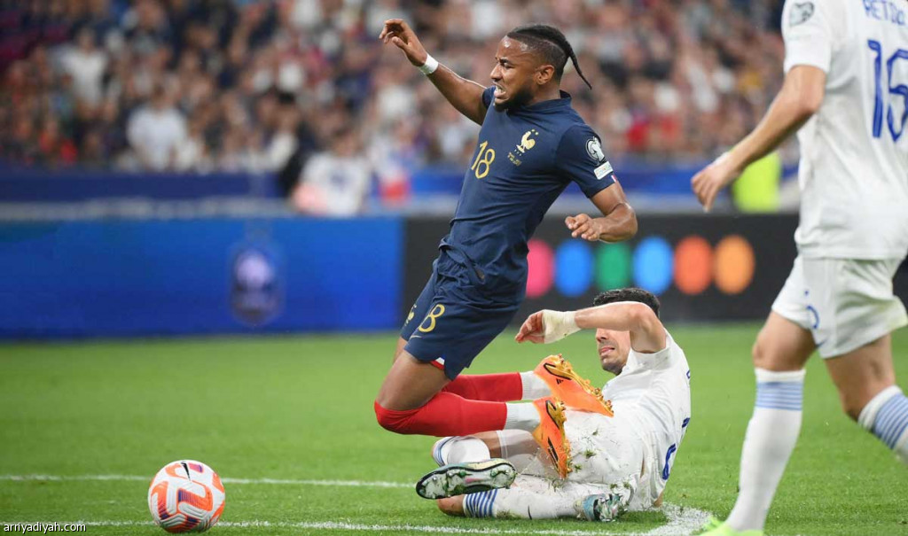 صورة التقطت أمس الأول للفرنسي كريستوفر نكونكو يسقط بعد اعتراض اليوناني ديميتريوس كوربيليس خلال لقاء جمع منتخبيهما في التصفيات المؤهلة لنهائيات كأس الأمم الأوروبية (الفرنسية)