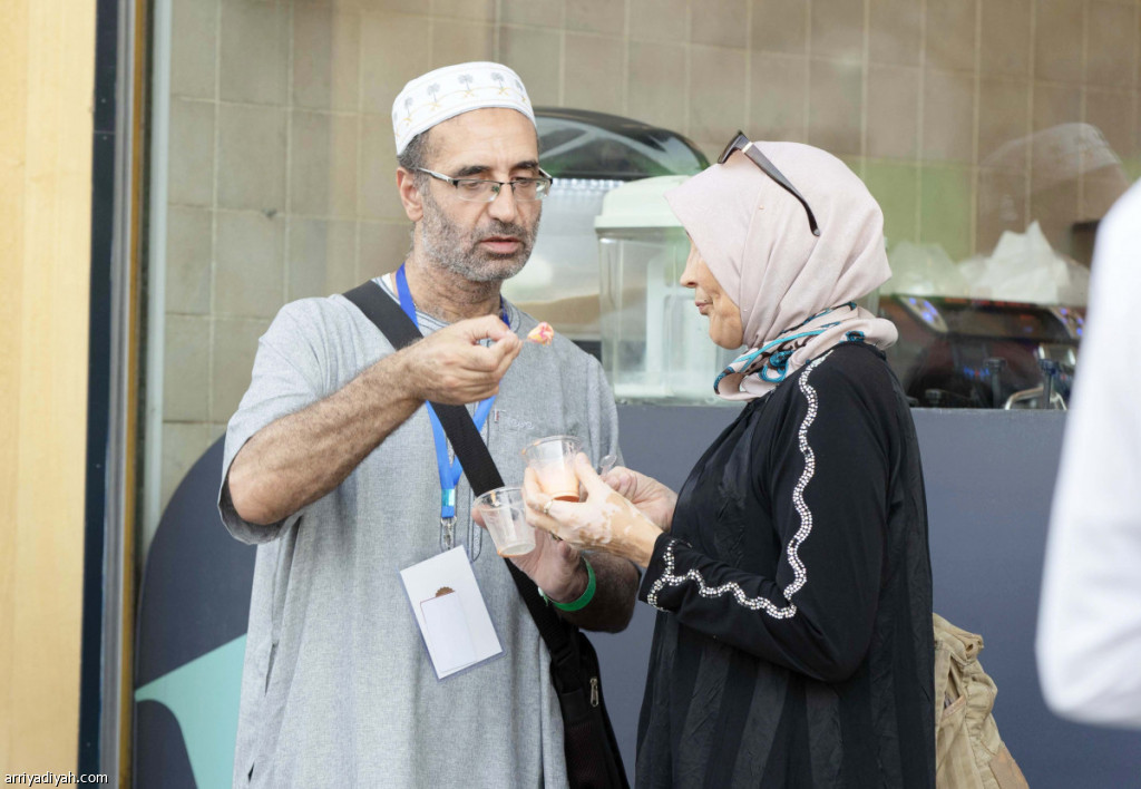 صورة التقطت أمس لحاج يُطعِم زوجته الآيس كريم أمام متجر للمرطبات في أحد شوارع مكة المكرمة توقّفا أمامه للشراء قبل التوجّه إلى مشعر منىتصوير: عدنان مهدلي