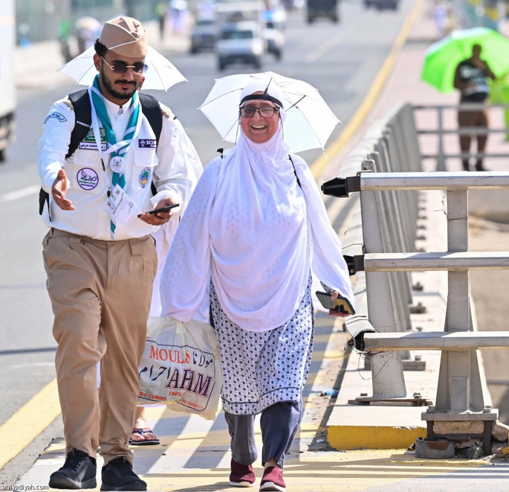 صورة التقطت أمس لفردٍ من فِرَق الكشّافة السعودية يرشد حاجّةً في طريقها إلى مشعر مِنى لقضاء يوم التروية استعدادًا للتوجّه إلى عرفات تصوير: علي خمج
