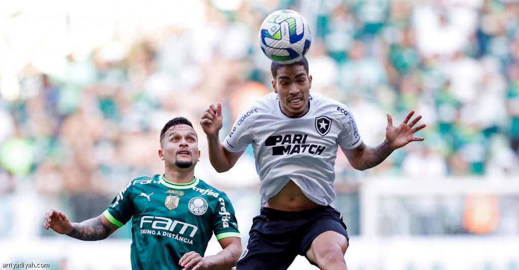صورة التقطت أمس لهوجو الظهير الأيسر لبوتافوجو يسدد الكرة برأسه بمتابعة أرتور فيكتور مهاجم بالميراس خلال مباراة الفريقين (رويترز)