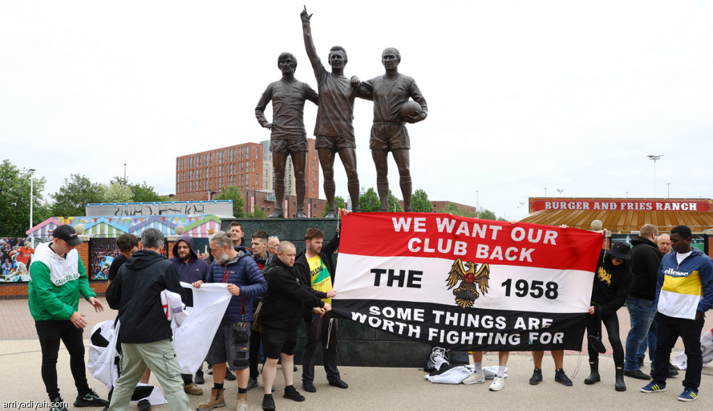 صورة التقطت أمس لمشجعي مان يونايتد في حملة اعتراضات جديدة ضد عائلة جلازر في أولد ترافورد بعد الكشف عن ملابس الموسم المقبل (رويترز)