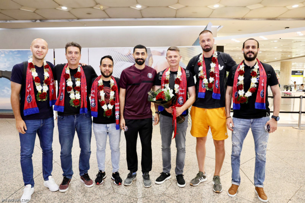 صورة التقطت أمس للكرواتي أنتي ميشا، مدرب فريق العدالة الأول لكرة القدم الجديد، برفقة الطاقم الفني المساعد خلال وصولهم إلى الأحساء(المركز الإعلامي ـ العدالة)
