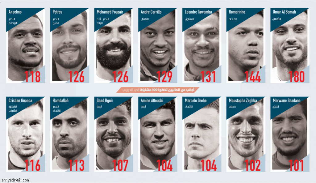 تتضمن قائمة المحترفين الأجانب الذين تخطّوا 100 مشاركة في دوري المحترفين، 14 لاعبًا من الأسماء الحالية، يتصدرها السوري عمر السومة، مهاجم فريق الأهلي الأول لكرة القدم.