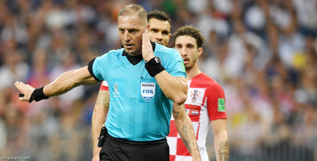 صورة التقطت للحكم الأرجنتيني نيستور بيتانا أثناء اتصاله مع حكام تقنية الـVAR في نهائي مونديال العالم 2018 بين منتخبي كرواتيا وفرنسا (الموقع الإلكتروني لـ”فيفا”)