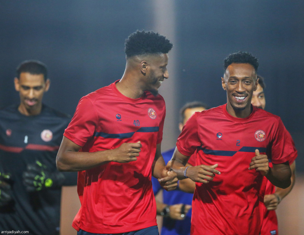 صورة التقطت أمس لسلطان فقيه وحسن الشمراني، لاعبي فريق ضمك، خلال التدريبات (المركز الإعلامي ـ ضمك)