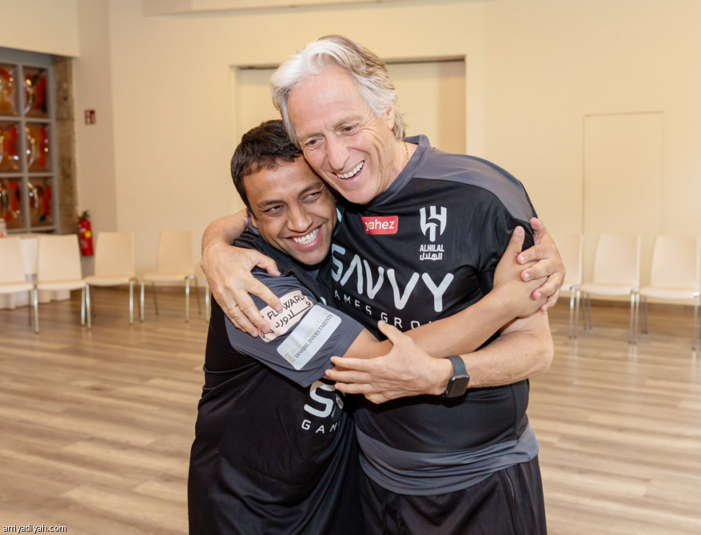 صورة التقطت أمس للبرتغالي خورخي خيسوس، مدرب فريق الهلال الأول لكرة القدم، يحتضن محمد الشلهوب بعد وصوله إلى معسكر “الأزرق” في النمسا (المركز الإعلامي ـ الهلال)