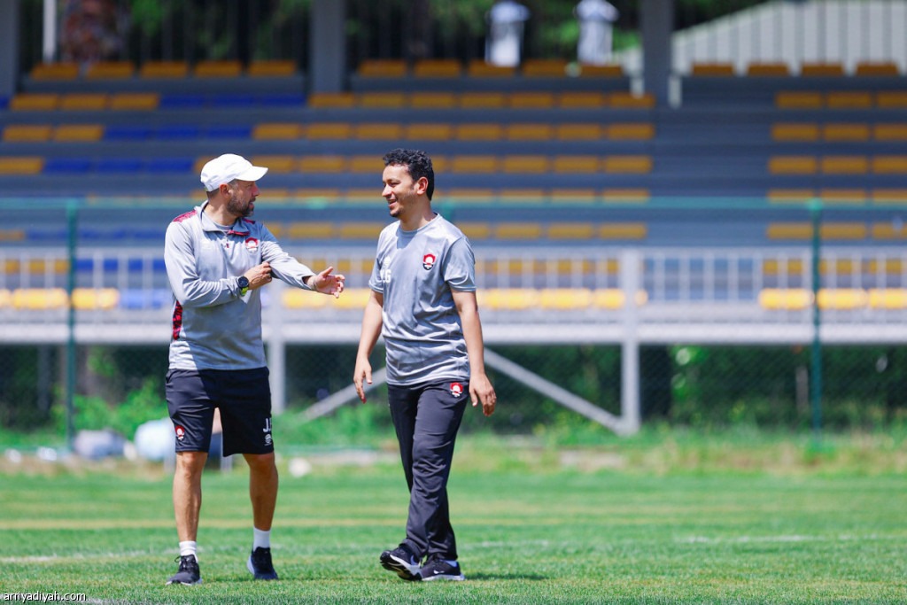 صورة التقطت أمس للكرواتي إيجور يوفيتيتيش، مدرب الرائد، وبرفقته وليد الغنيم، إداري الفريق، قبل انطلاق التدريبات في معسكر تركيا (المركز الإعلامي ـ الرائد)