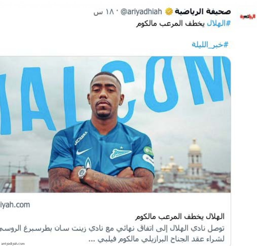 استحوذ خبر صحيفة “الرياضية” الذي كشف عن قرب تعاقد الهلال مع البرازيلي مالكوم فيلبي لاعب فريق زينت سان بطرسبرج الروسي الأول لكرة القدم على اهتمامات مستخدمي موقع التدوينات القصيرة تويتر خلال الـ24 ساعة الماضية.