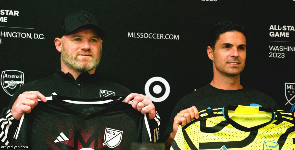 صورة التقطت أمس للإسباني ميكيل أرتيتا، مدرب أرسنال، وواين روني، مدرب نجوم الدوري الأمريكي، يستعرضان القمصان قبل لقاء الفريقين(الفرنسية)