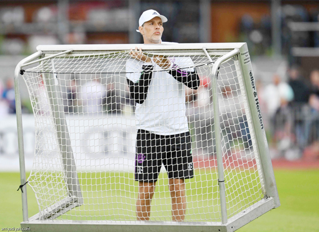 صورة التقطت أمس للألماني توماس توخيل، مدرب فريق بايرن ميونيخ، يحمل أحد الأبواب المتنقّلة خلال التدريبات (الفرنسية)