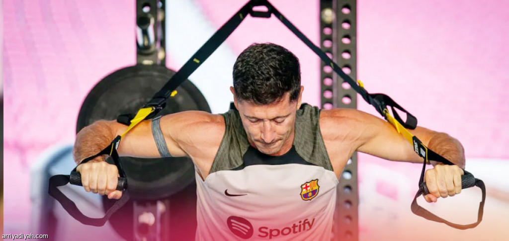 صورة التقطت أمس للبولندي روبرت ليفاندوفسكي، لاعب برشلونة الإسباني، خلال تنفيذ تدريب بدني (المركز الإعلامي - برشلونة)