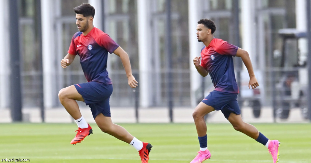 صورة التقطت أمس للفرنسي وارين إيميري، لاعب الوسط، والجناح الإسباني ماركو أسينسيو خلال الحصة التدريبية لفريق باريس سان جيرمان (المركز الإعلامي ـ بي إس جي)