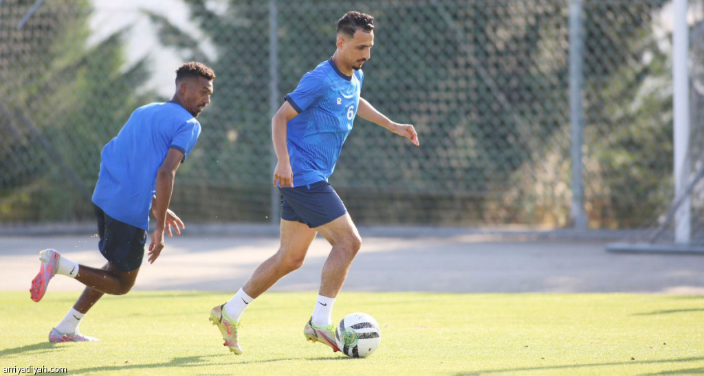 صورة التقطت أمس الأول لأحمد الجويد، لاعب وسط الحزم، يركض بالكرة وسط متابعة زميله المهاجم تركي المطيري، أثناء أدائهما التدريبات(المركز الإعلامي ـ الحزم)