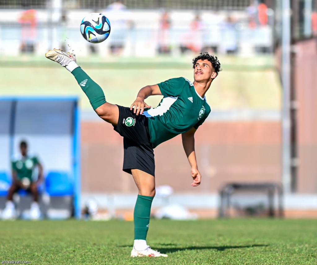صورة التقطت أمس لعبد الرحمن سحاري، لاعب المنتخب السعودي تحت 15 عامًا لكرة القدم، يستعرض مهاراته قبل انطلاق المناورة (المركز الإعلامي ـ اتحاد القدم)