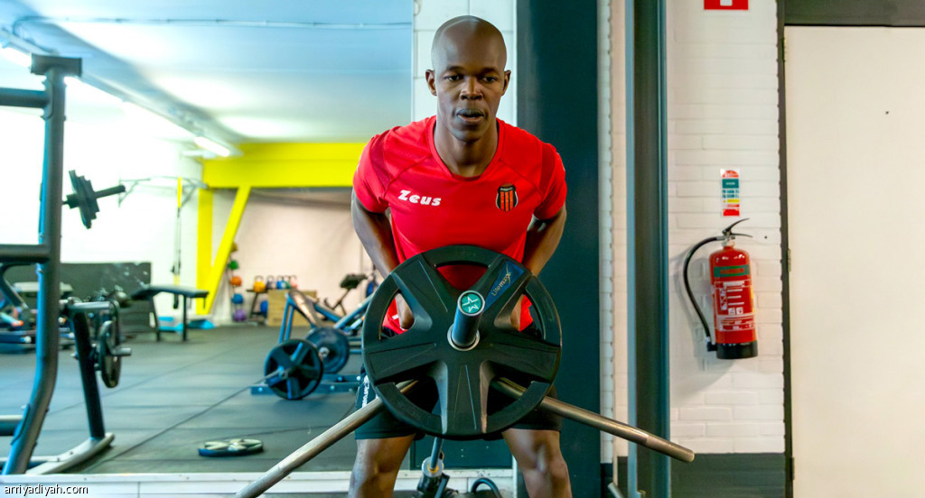 صورة التقطت للزيمبابوي ناوليدج موسونا، لاعب فريق الرياض، يرفع وزنًا خلال الحصة اللياقية (المركز الإعلامي ـ الرياض)