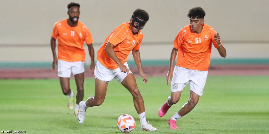 صورة التقطت أمس لأحمد الغامدي مرتديًا القناع خلال مناورة الاتفاق، وإلى جانبه نواف هزازي (المركز الإعلامي ـ الاتفاق)