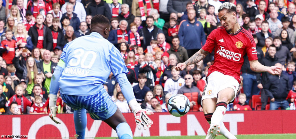 صورة التقطت أمس للمهاجم البرازيلي أنتوني يسدِّد كرةً في شباك لانس الفرنسي خلال مباراة تجريبية على ملعب “أولد ترافورد” (الفرنسية)
