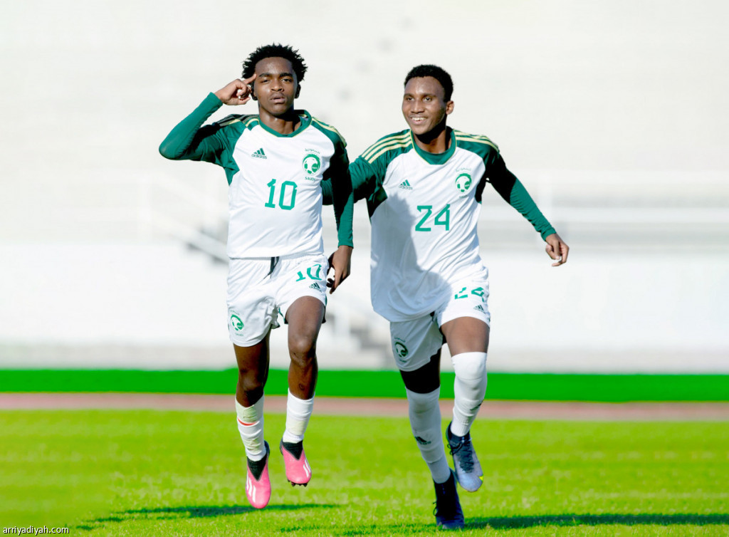 صورة التقطت أمس للاعبين من المنتخب السعودي تحت 16 عامًا لكرة القدم يحتفلان بالهدف الرابع الذي جاء عبر مختار برناوي في شباك الإمارات خلال اللقاء التجريبي (المركز الإعلامي ـ اتحاد القدم)