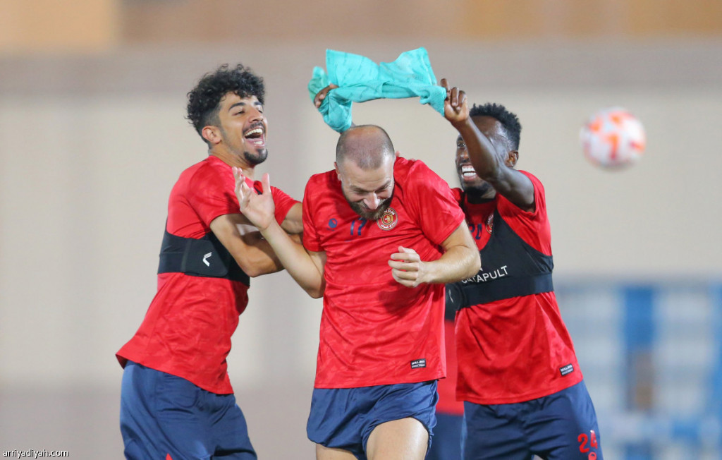 صورة التقطت أمس لحسن أبو شرارة وعبد العزيز الشهراني، لاعبَي ضمك، يمازحان زميلهما الكرواتي دوماجوج أنتوليتش قبل انطلاق التدريبات الجماعية (المركز الإعلامي ـ ضمك)