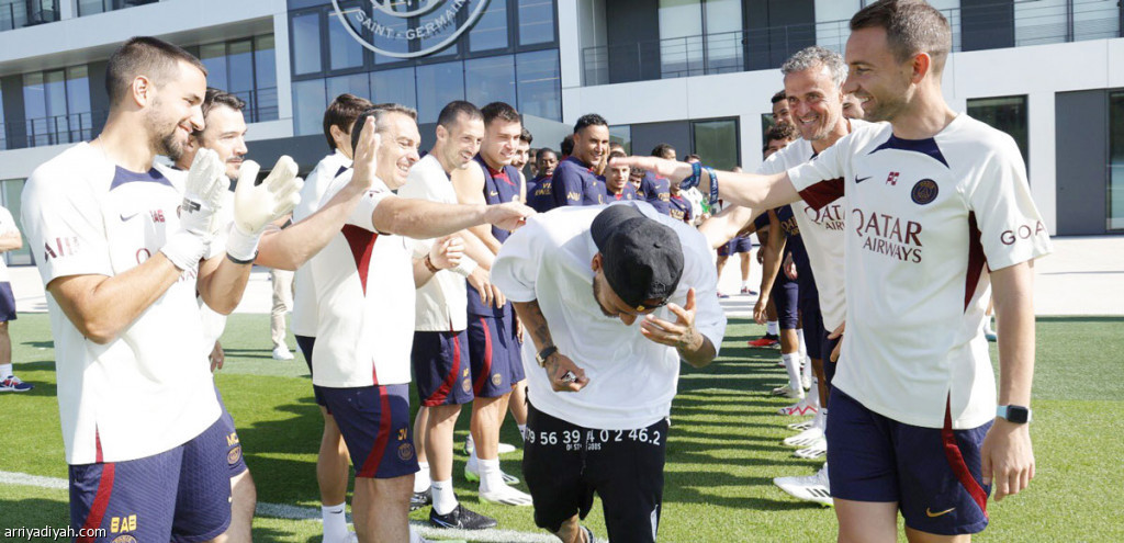 صورة التقطت أمس للبرازيلي نيمار، لاعب الهلال، خلال وداعه من قِبل لاعبي باريس سان جيرمان الفرنسي (المركز الإعلامي ـ باريس سان جيرمان)