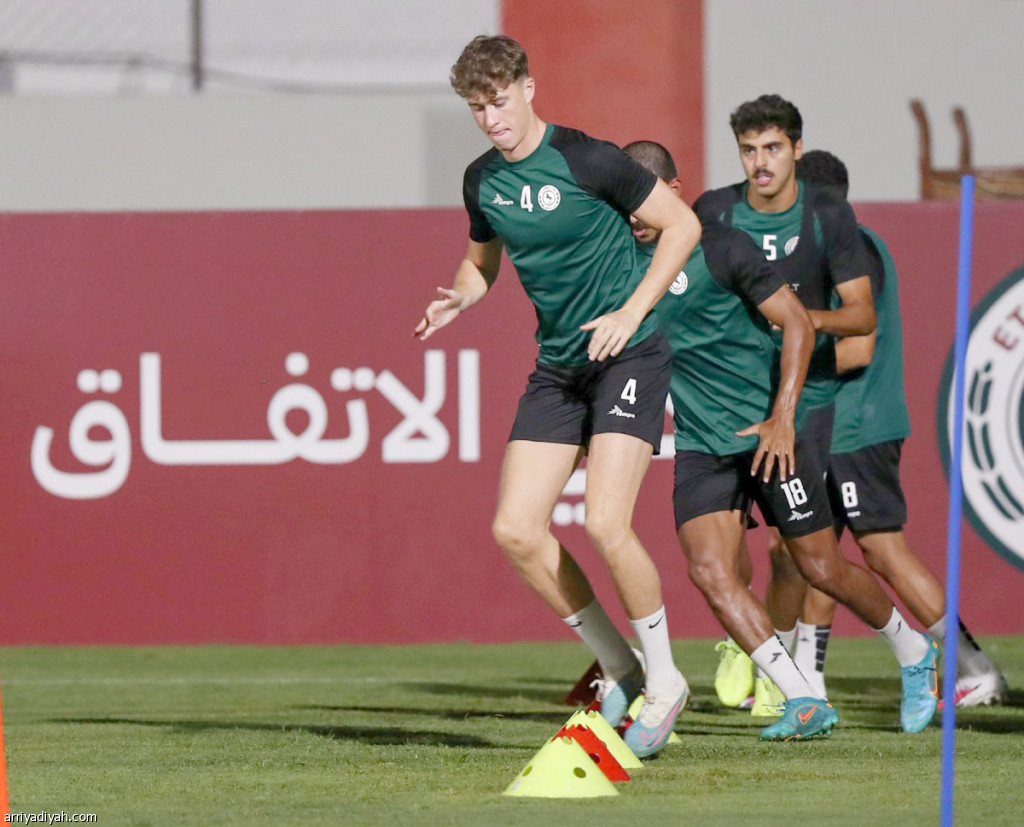 صورة التقطت أمس للإسكتلندي جاك هيندري، مدافع فريق الاتفاق الأول لكرة القدم، يعبر الحواجز في التدريبات برفقة زملائه محمد محزري وسعد الموسى وحامد الغامدي (المركز الإعلامي ـ الاتفاق)
