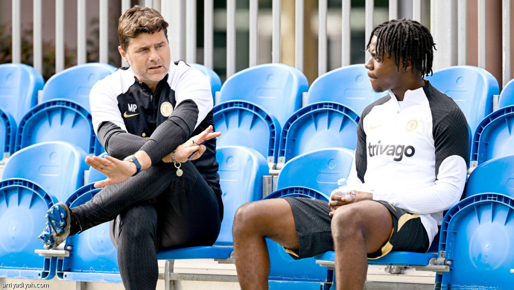 صورة التقطت أمس للبلجيكي روميو لافيا، لاعب الوسط، يستمع إلى المدرب ماوريسيو بوكيتينو قبل انطلاق تدريب تشيلسي(المركز الإعلامي ـ تشيلسي)