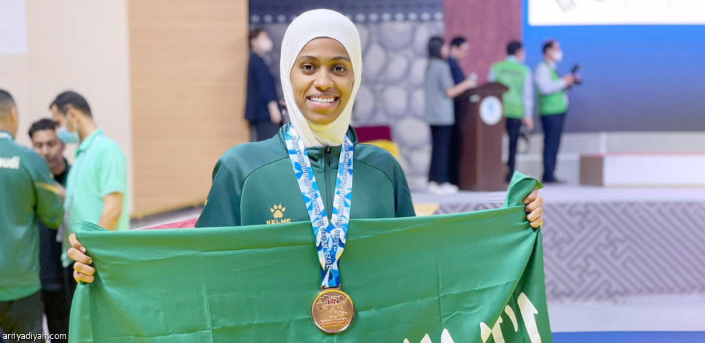 صورة التقطت أمس للسعودية دنيا أبو طالب تحمل العلم السعودي عقب فوزها ببرونزية وزن 49 كيلوجرامًا في بطولة العالم (المركز الإعلامي ـ اتحاد التايكوندو)