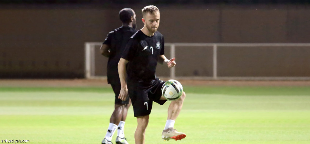 صورة التقطت أمس الأول للأسترالي كونور بيين مهاجم فريق العروبة الأول لكرة القدم يستلم الكرة في التدريبات (المركز الإعلامي ـ العروبة)