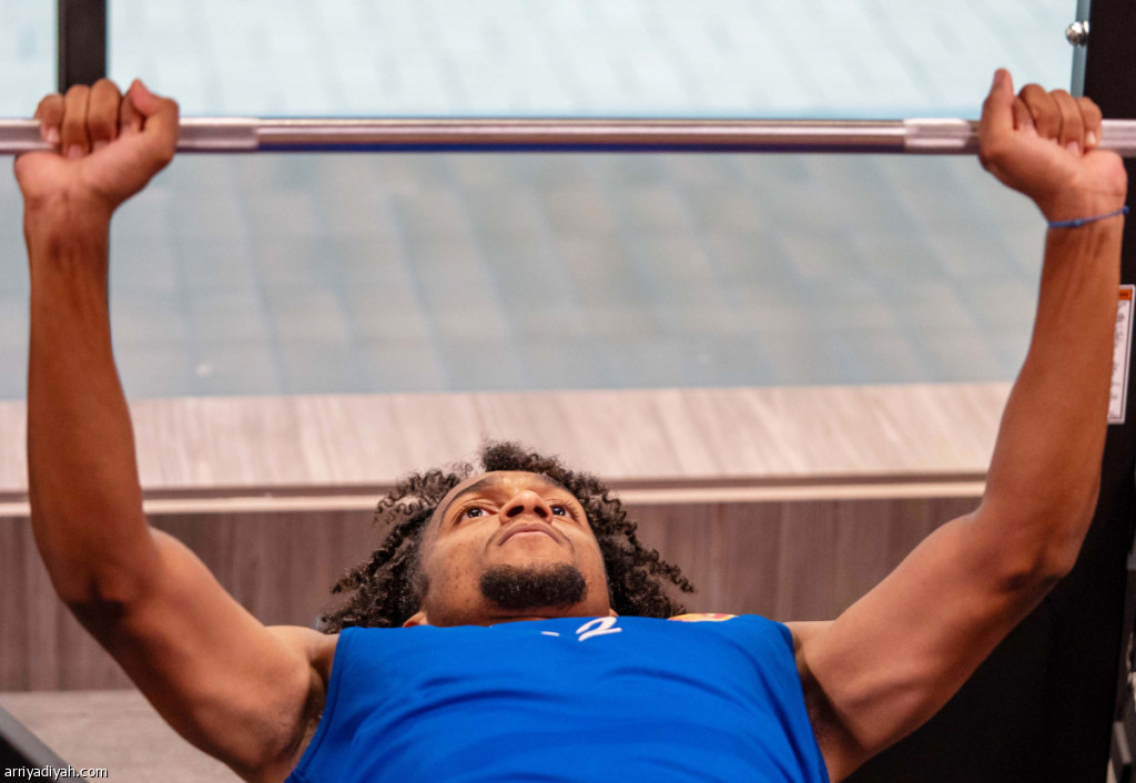 صورة التقطت أمس للبيروفي أندريه كاريلي، لاعب فريق القادسية الأول لكرة القدم، يؤدي تمارين لياقية في الصالة (المركز الإعلامي ـ القادسية)