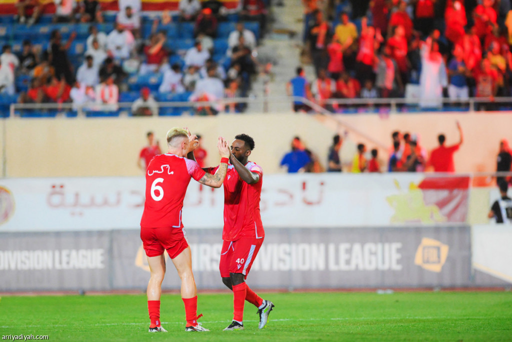 صورة التقطت أمس لإبراهيم محنشي لاعب فريق القادسية يحتفل مع البريطاني ماكس باور بعد تسجيله الهدف الأول في شباك الباطن ضمن اللقاء الذي انتهى لمصلحة القادسية 2ـ1 (المركز الإعلامي ـ دوري يلو)