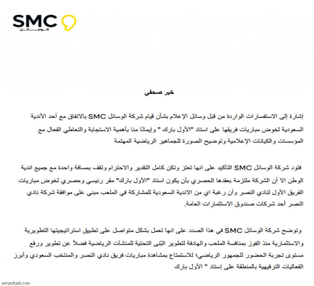 جاء ذلك في بيان للشركة، أمس، ردًّا على ما أثير أخيرًا حول الاتفاق مع أحد الأندية السعودية لخوض مباريات فريقها على الملعب، وقالت شركة الوسائل في بيانها: “إشارة إلى الاستفسارات من قبل وسائل الإعلام بشأن اتفاق شركة الوسائل SMC مع أحد الأندية السعودية لخوض مباريات فريقها على ملعب الأول بارك، وإيمانًا منا بأهمية الاستجابة والتعاطي الفاعل مع المؤسسات والكيانات الإعلامية، وتوضيح الصورة للجماهير الرياضية المهتمة، تود شركة الوسائل SMC التأكيد أنها تعتز وتكن كامل التقدير والاحترام وتقف بمسافة واحدة مع جميع أندية الوطن، إلا أن الشركة ملتزمة بعقدها الحصري بأن يكون ملعب الأول بارك مقرًّا رئيسًا وحصريًّا لخوض مباراة فريق النصر الأول لكرة القدم، وأن رغبة أي من الأندية السعودية للمشاركة في الملعب مبنية على موافقة شركة النصر، إحدى شركات صندوق الاستثمارات العامة”.