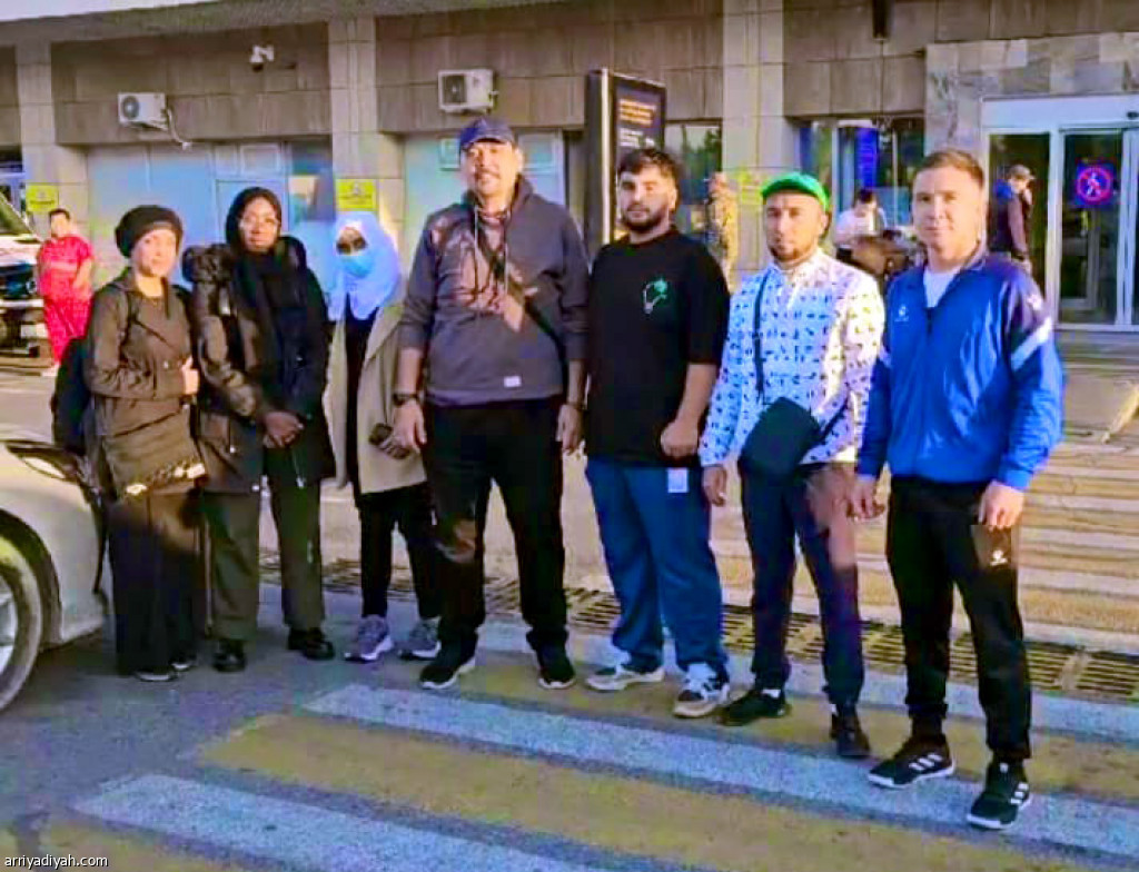 صورة التقطت أمس لعلي سراج، مدرب أخضر الكوراش، يتوسط أعضاء البعثة لدى وصولهم إلى قرغيزستان (المركز الإعلامي ـ اللجنة السعودية للكوراش)