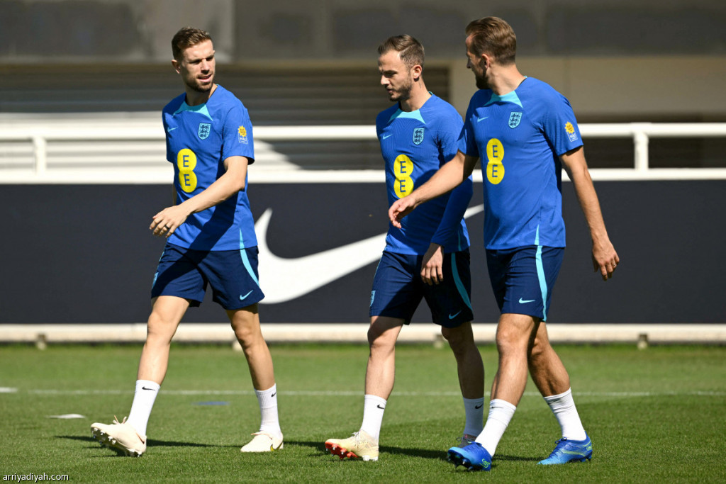 صورة التقطت أمس لجوردان هندرسون، لاعب فريق الاتفاق، مع زميليه ماديسون، لاعب توتنهام، وهاري كين، مهاجم بايرن ميونيخ، خلال تدريبات المنتحب الإنجليزي (الفرنسية)