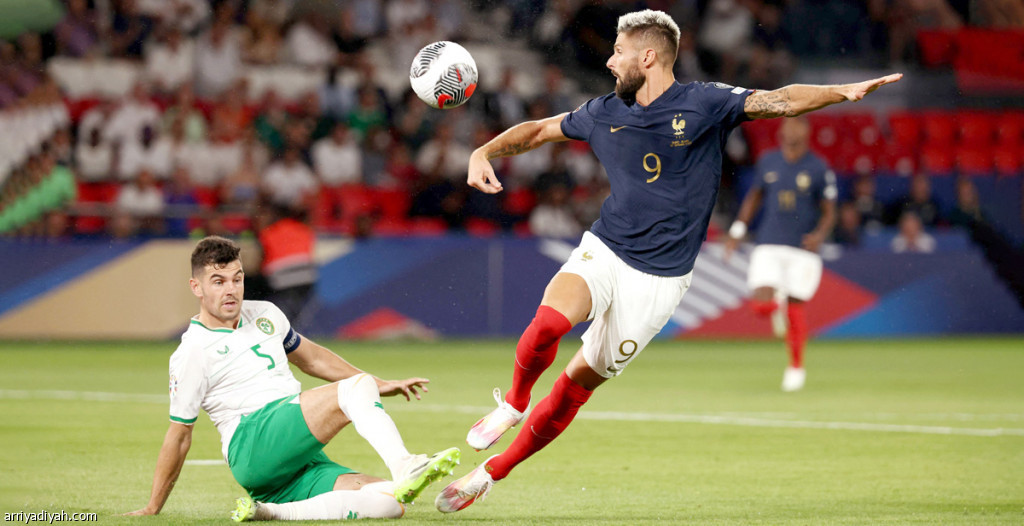 صورة التقطت أمس الأول للفرنسي أوليفييه جيرو يحاول تسديد كرةٍ وسط اعتراضٍ من جون إيجان، مدافع إيرلندا (الفرنسية)