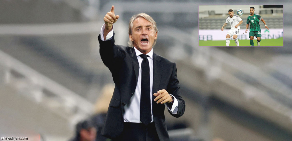 صورة التقطت أمس لمانشيني يوجه اللاعبين خلال المباراة.. وفي الإطار سالم الدوسري قائد المنتخب وجيفري لاعب كوستاريكا يتنافسان على الكرة(الفرنسية)