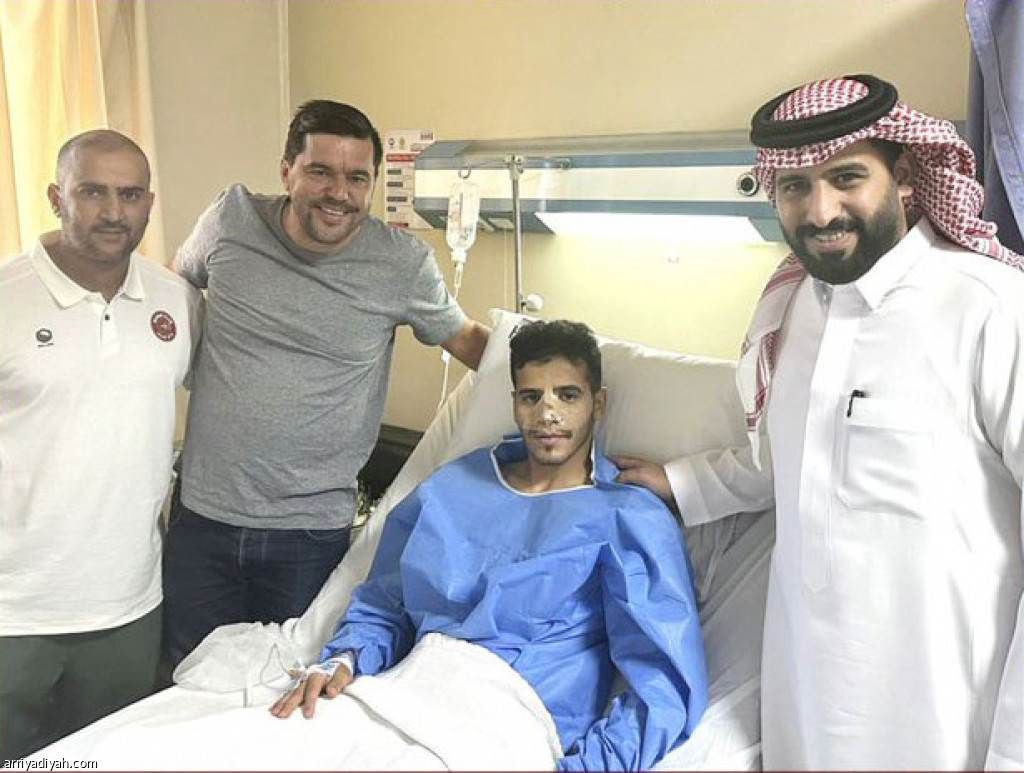 صورة التقطت أمس لأحمد حريصي لاعب فريق ضمك على السرير الأبيض وإلى جانبه خالد آل مشعط رئيس النادي والروماني كوزمين كونترا مدرب الفريق (المركز الإعلامي ـ ضمك)