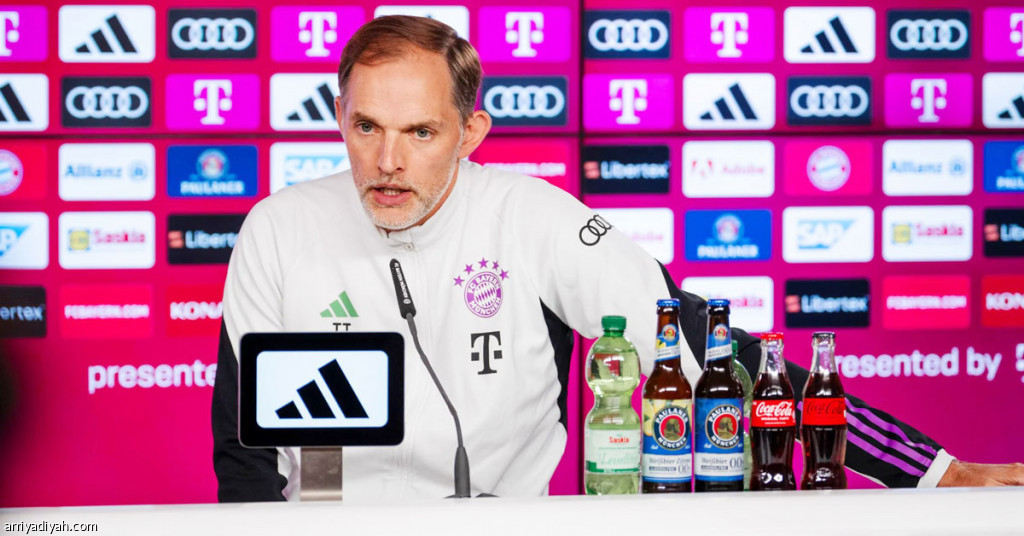 صورة التقطت أمس للألماني توماس توخيل، مدرب بايرن ميونيخ، يتحدث في المؤتمر الصحافي الخاص بمواجهة ليفركوزن (المركز الإعلامي ـ بايرن ميونيخ)