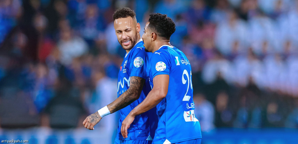 صورة التقطت أمس لنيمار وسالم الدوسري يحتفلان بعد تسجيل أحد الأهداف في المباراة التي جرت على ملعب فيصل بن فهد في الرياض (المركز الإعلامي ـ الهلال)