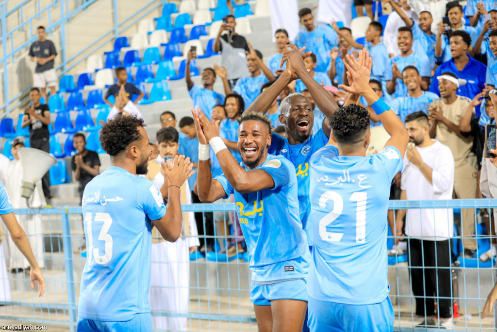 صورة التقطت أمس للاعبي فريق الباطن يحتفلون مع جماهيرهم عقب الانتصار على أحد (المركز الإعلامي ـ دوري يلو)