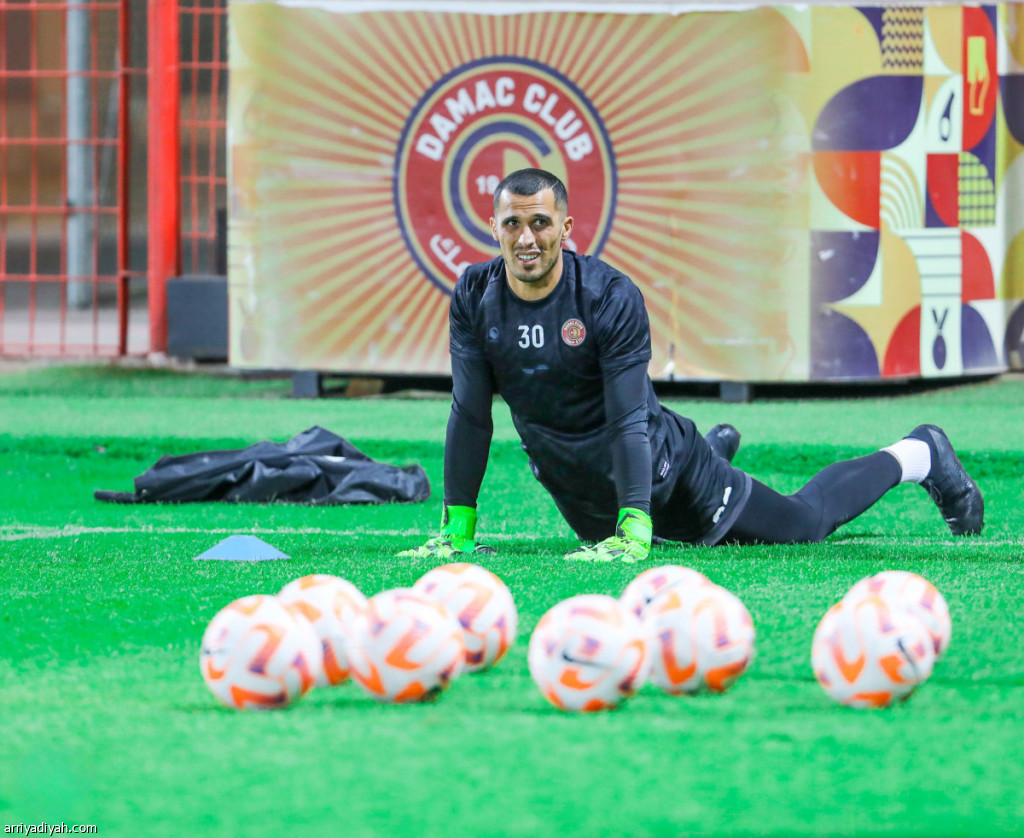 صورة التقطت أمس للجزائري مصطفى زغبة، حارس ضمك، خلال الحصة التدريبية (المركز الإعلامي ـ ضمك)