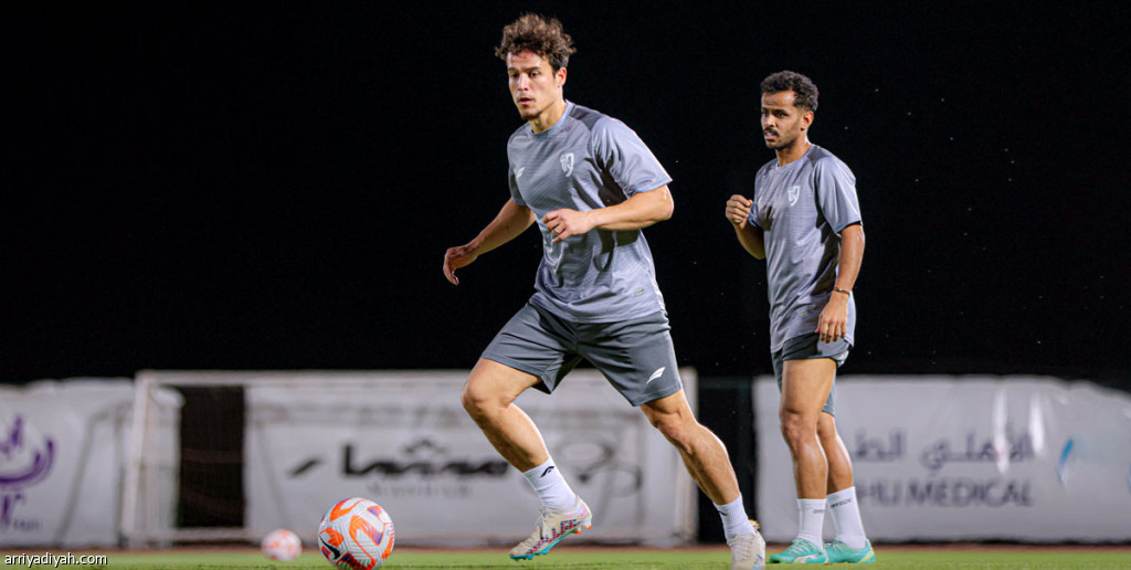 صورة التقطت أمس لجمال باجندوح، لاعب الطائي، يتدرب بالكرة ويبدو خلفه زميله عبد الفتاح عسيري (المركز الإعلامي ـ الطائي)