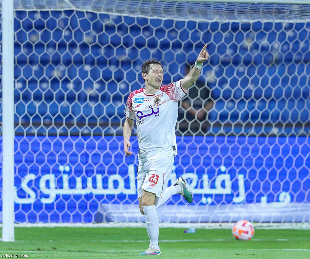 صورة التقطت أمس الأول لجودوين لاعب الوحدة يحتفل بهدفه في مرمى الفتح (المركز الإعلامي ـ دوري روشن)