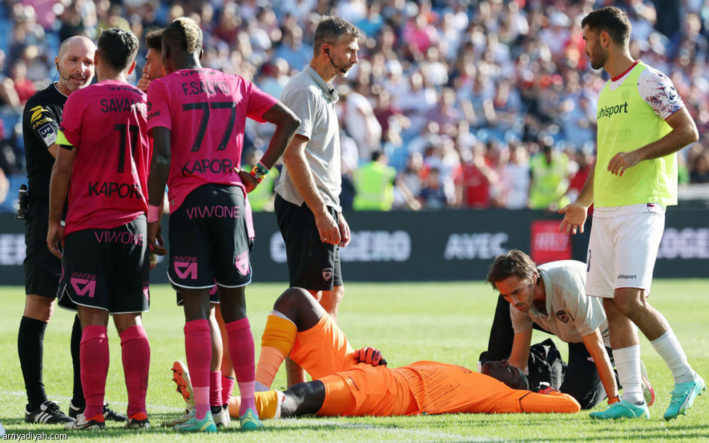 صورة التقطت أمس للحارس موري دياو يتألم بعد إصابته بمفرقعات نارية في مونبلييه (الفرنسية)