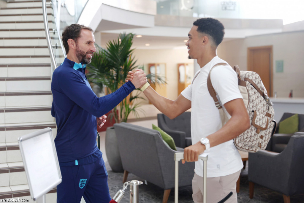 صورة التقطت أمس لساوثجيت، مدرب إنجلترا، يصافح أرنولد عند دخوله معسكر الأسود الثلاثة(المركز الإعلامي ـ المنتخب الإنجليزي)