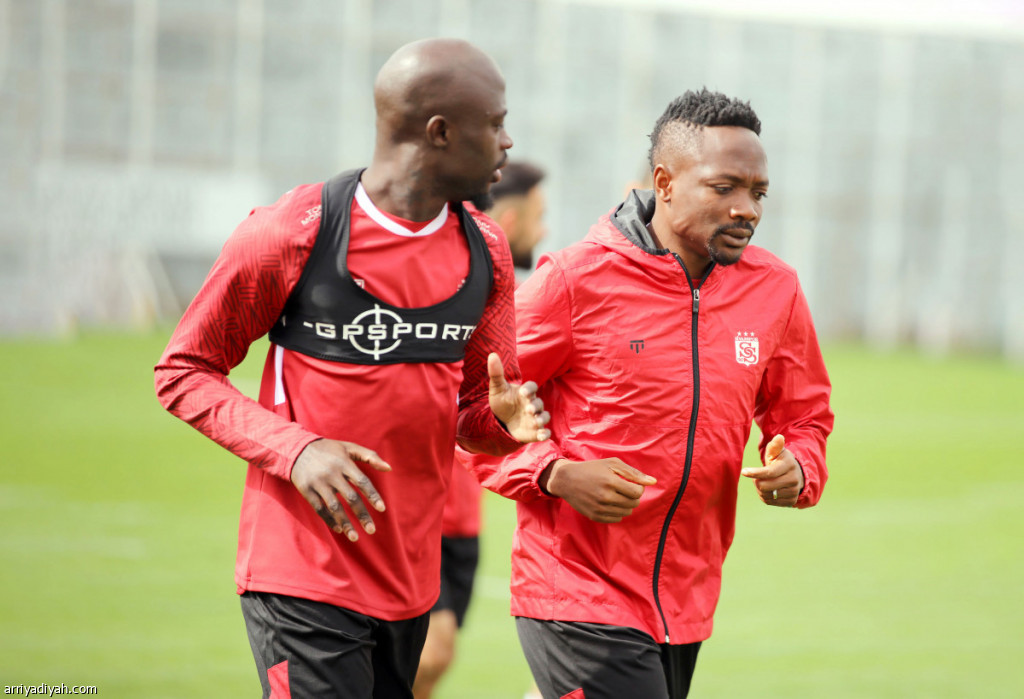 صورة التقطت في 4 أكتوبر الجاري للنيجيري أحمد موسى، مهاجم فريق سيفاسبور التركي الأول لكرة القدم، يشارك في حصة تدريبية للفريق، وإلى جواره الجناح الجامبي مودو بارو، لاعب الأهلي السعودي السابق وزميل موسى حاليًا (المركز الإعلامي ـ سيفاسبور)