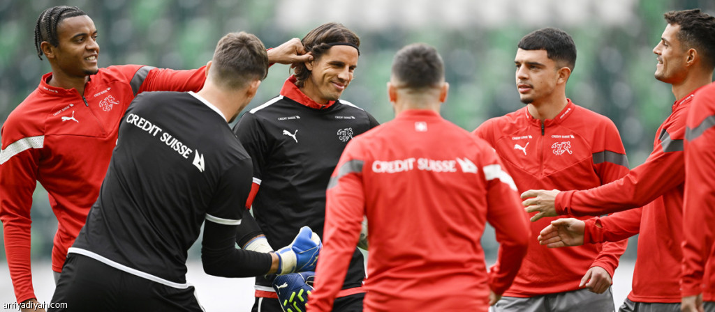 صورة التقطت أمس ليان سومر، حارس مرمى المنتخب السويسري، وزميله مانويل أكانجي خلال الحصة التدريبية استعدادًا للقاء بيلاروسيا اليوم (الفرنسية)