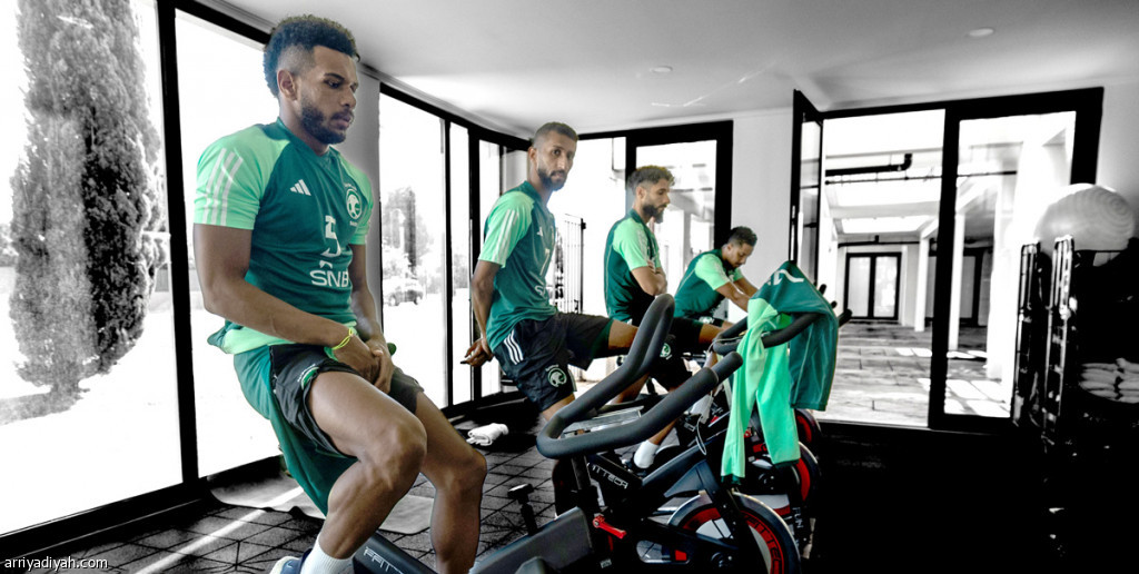صورة التقطت أمس لعلي البليهي، مدافع الأخضر، وزملائه سلمان الفرج وصالح الشهري وهيثم عسيري، يتدربون بالدراجة الثابتة في مقر معسكر البرتغال الإعدادي(المركز الإعلامي ـ المنتخب السعودي)