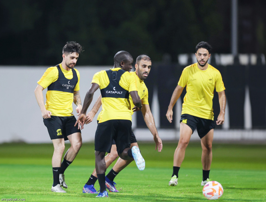 صورة التقطت أمس لنور الدين البحار والفرنسي نجولو كانتي والمغربي عبد الرزاق حمد الله والبرازيلي إيجور كورونادو، لاعبي الاتحاد، يتبادلون الكرة خلال التدريبات (المركز الإعلامي ـ الاتحاد)